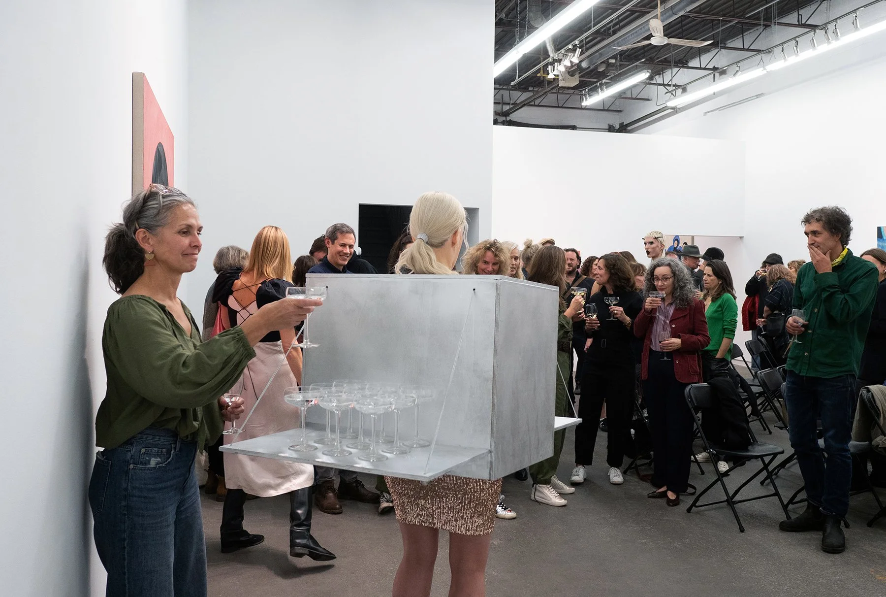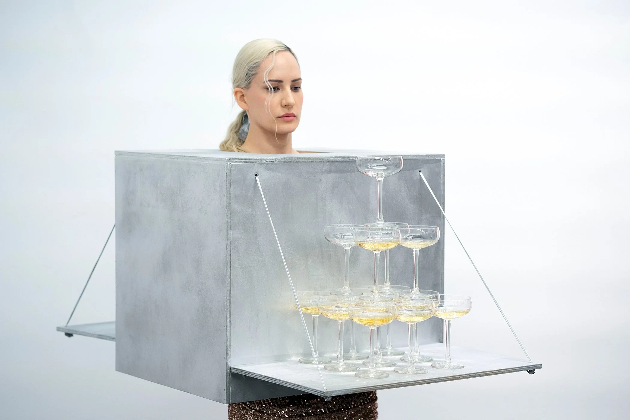 Balancing the Towers was a performance experiment that utilized weight and balance to explore themes of labour, gender, and trust. The project continued the artist's inquiry into how much weight their body could hold. It involved the artist donning a wearable table contraption and stabilizing two towers of champagne glasses. Champagne was served from one tower and water from the other. The artist's arms and shoulders supported the device, weighing over 50 pounds, as they wore high heels. The guests determined the duration of the performance; it concluded when the last glass was taken. Despite multiple probable outcomes, no glasses shattered, though the artist almost collapsed near the end of the performance.
